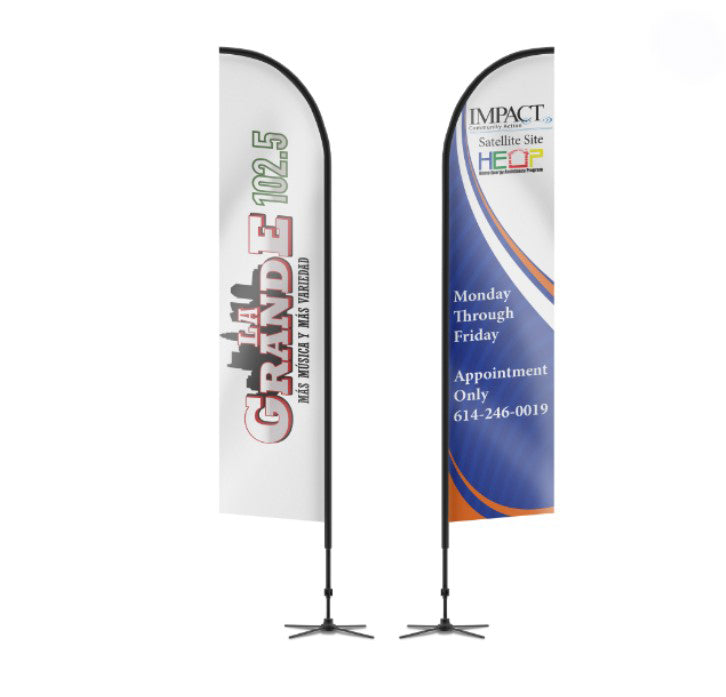 Custom Flags are great height for garnering attention outdoors and one of our best selling display products. Custom printed on polyester mesh by the process of dye sublimation, inks heavily saturate the material to create a "bleed-through" visual effect for single-sided prints, and double-sided prints are finished with a silver-gray blocker that lays between.