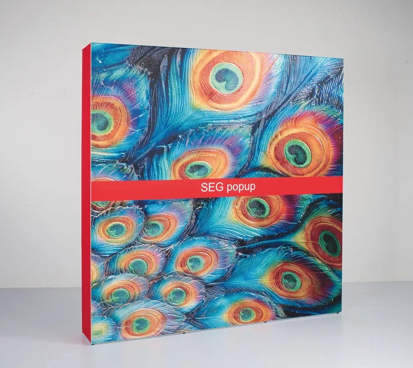 This SEG pop-up display, backwall for 10' booth. Durable frame and channel bars. Graphic size is 117.75"x89". Graphic size for full wrap is 143.75"x89". It could be modular displays by connecting units.